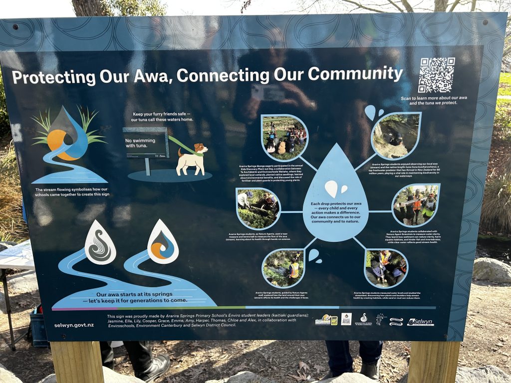 Recently our environmental leaders celebrated with the Selwyn District Council and Environment Canterbury as the sign on the Liffey giving information about local tuna was unveiled. This was a collaboration with Springston School and led by Matt Stanford from EnviroSchools and Whaea Larissa. The sign is informative and an example of learning having a positive impact on the community. Great mahi team!
