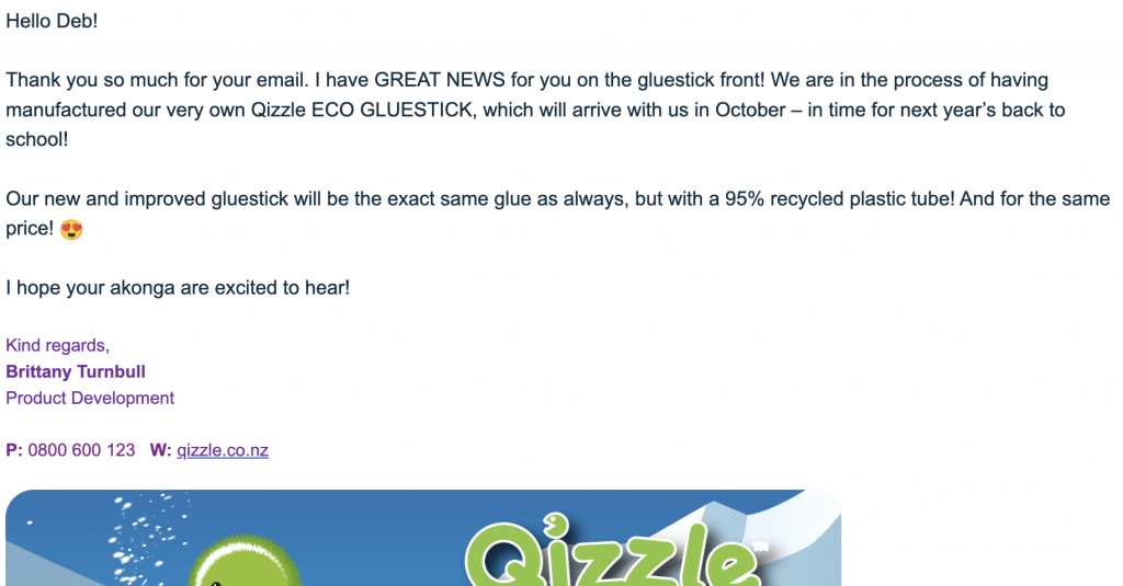 Firstly, in 2025 our Year 2 & 3 inquiry group contacted Qizzle to give feedback about their gluestick and how the lids get lost and it is made from plastic. Qizzle has been in touch to say they have redesigned their gluestick and it is now to be made with 95% recyclable plastic. This gives the children a solid example of the power of action and they can make a difference.